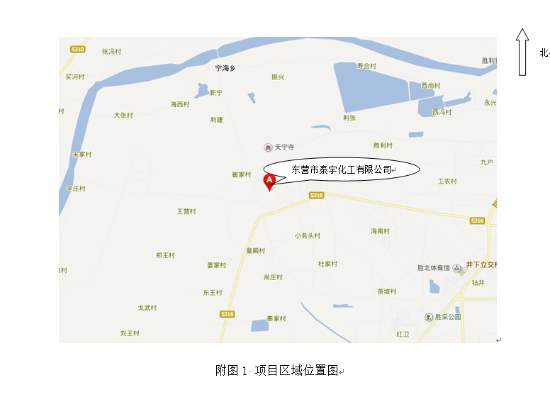 東營市泰宇化工有限公司位于墾利縣勝坨鎮工業園區。廠區北面為勝坨鎮工業園區道路,路對面為東辰集團建筑安裝有限公司,南側為寶仕達公司(為油田生產設備配件的企業),東側為東辰集團溶劑油項目,西側為工業園區道路,道路西側為空地。 |
