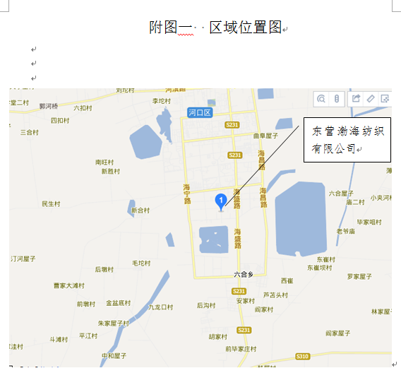 東營渤海紡織有限公司位于東營市河口區海河路以西、陽河路以北,占地面積100畝。廠區所在地南面為陽河路,距離為20m,廠區西面為東營市布萊特石油裝備有限公司、東營市三鎮服飾有限公司,距離大約15m;東面為海河路,距離大約為20m,海河路以東為金色河口(集團)新型材料有限責任公司、預制砂漿廠、東營建友新型材料有限公司、匯昶飼料廠和東營市廣和化工有限公司),距離為80m;北面為金河路,距離大約為20m,金河路以北為東營市大中南實業有限公司,距離大約為120m。
