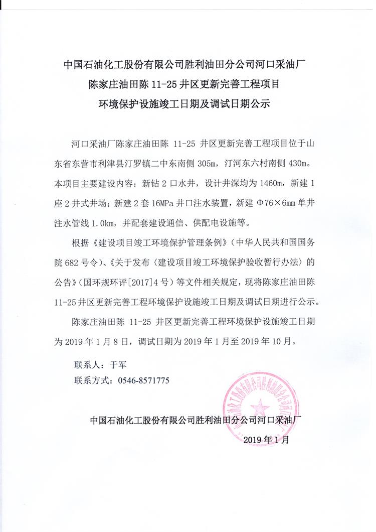 中國石油化工股份有限公司勝利油田分公司河口采油廠陳家莊油田陳11-25井區更新完善工程項目 環境保護設施竣工日期及調試日期公示