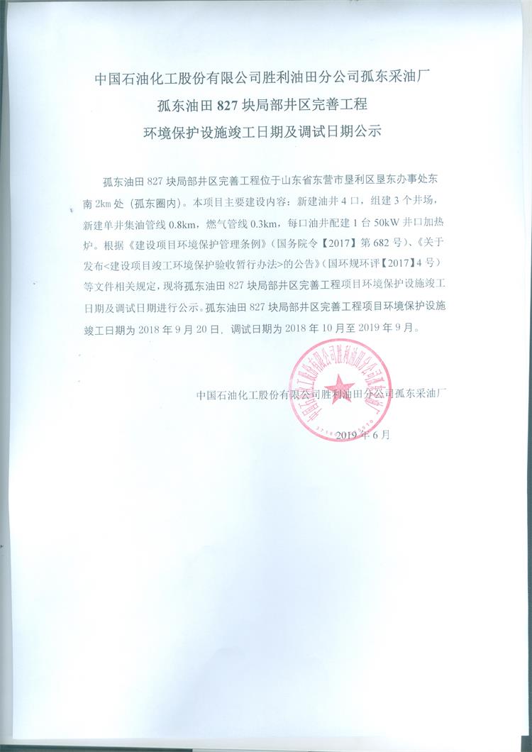 中國石油化工股份有限公司勝利油田分公司孤東采油廠孤東油田827塊局部井區完善工程環境保護設施竣工日期及調試日期公示